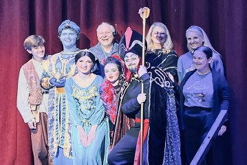 (FRONT ROW-L to R) Jaycie Wilcox [Jasmine], Maria Dowler [Lago], Isla Hambrick [Jafar], Music Director Lori Patterson
